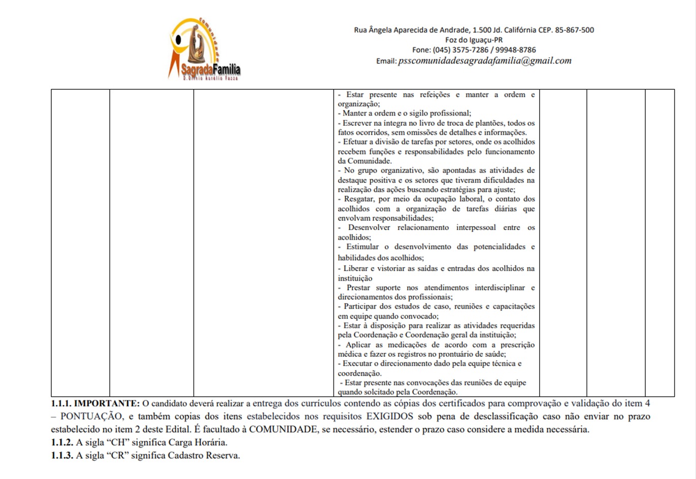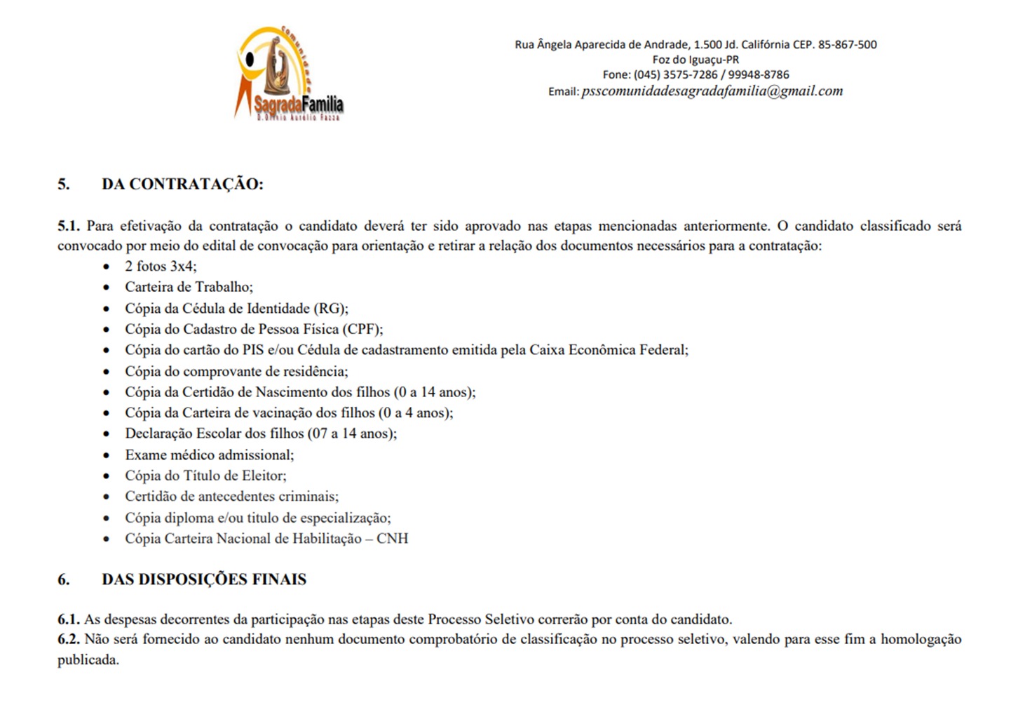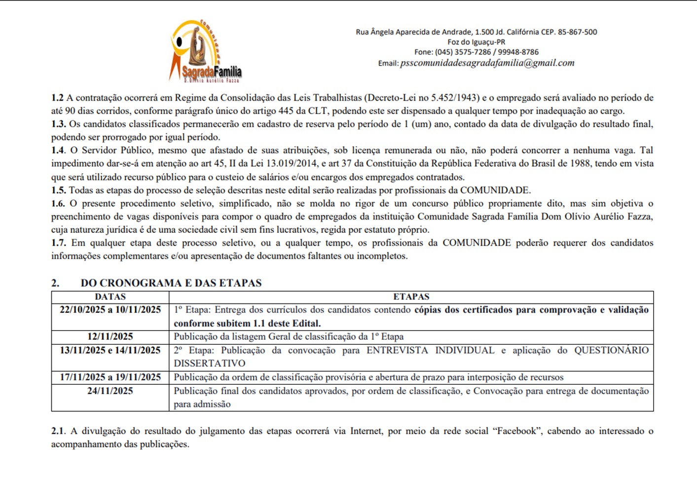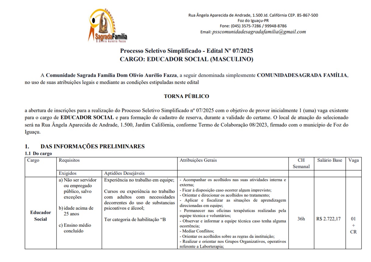 A Comunidade Sagrada Família Dom Olívio Aurélio Fazza, abre edital para a realização do Processo Seletivo Simplificado nº 07/2025 com o objetivo de prover inicialmente 1 (uma) vaga existente para o cargo de EDUCADOR SOCIAL e para formação de cadastro de reserva. O local de atuação do selecionado será na Rua Ângela Aparecida de Andrade, 1.500, Jardim Califórnia, conforme Termo de Colaboração 08/2023, firmado com o município de Foz do Iguaçu.