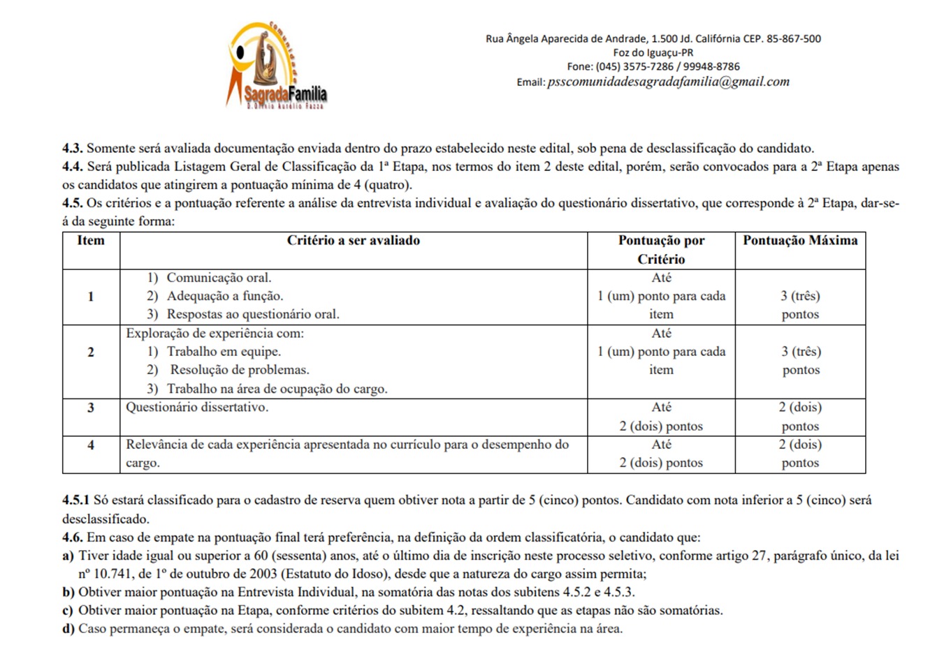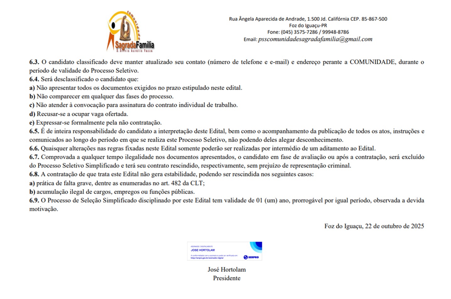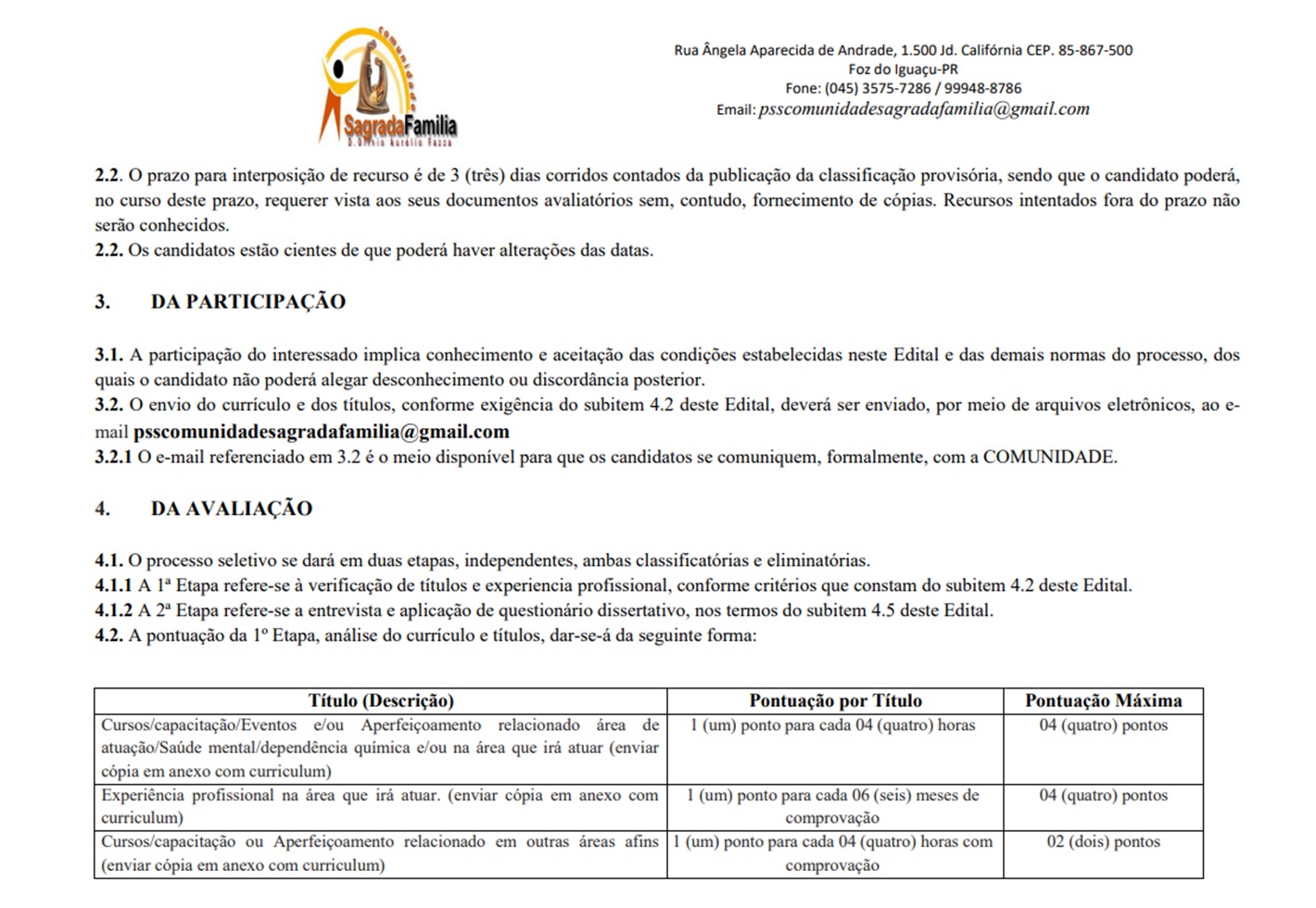 A Comunidade Sagrada Família Dom Olívio Aurélio Fazza, abre edital para a realização do Processo Seletivo Simplificado nº 07/2025 com o objetivo de prover inicialmente 1 (uma) vaga existente para o cargo de EDUCADOR SOCIAL e para formação de cadastro de reserva. O local de atuação do selecionado será na Rua Ângela Aparecida de Andrade, 1.500, Jardim Califórnia, conforme Termo de Colaboração 08/2023, firmado com o município de Foz do Iguaçu.